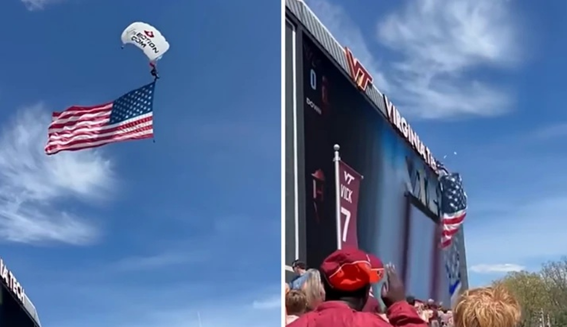 Ο εαρινός αγώνα ποδοσφαίρου του πανεπιστημίου Virginia Tech στις ΗΠΑ, σημαδεύτηκε από ένα σοβαρά ατύχημα, όταν ένας αλεξιπτωτιστής, που συμμετείχε στο εορταστικό πρόγραμμα, έχασε τον έλεγχο και προσέκρουσε με δύναμη στον γιγαντιαίο φωτεινό πίνακα του σταδίο.