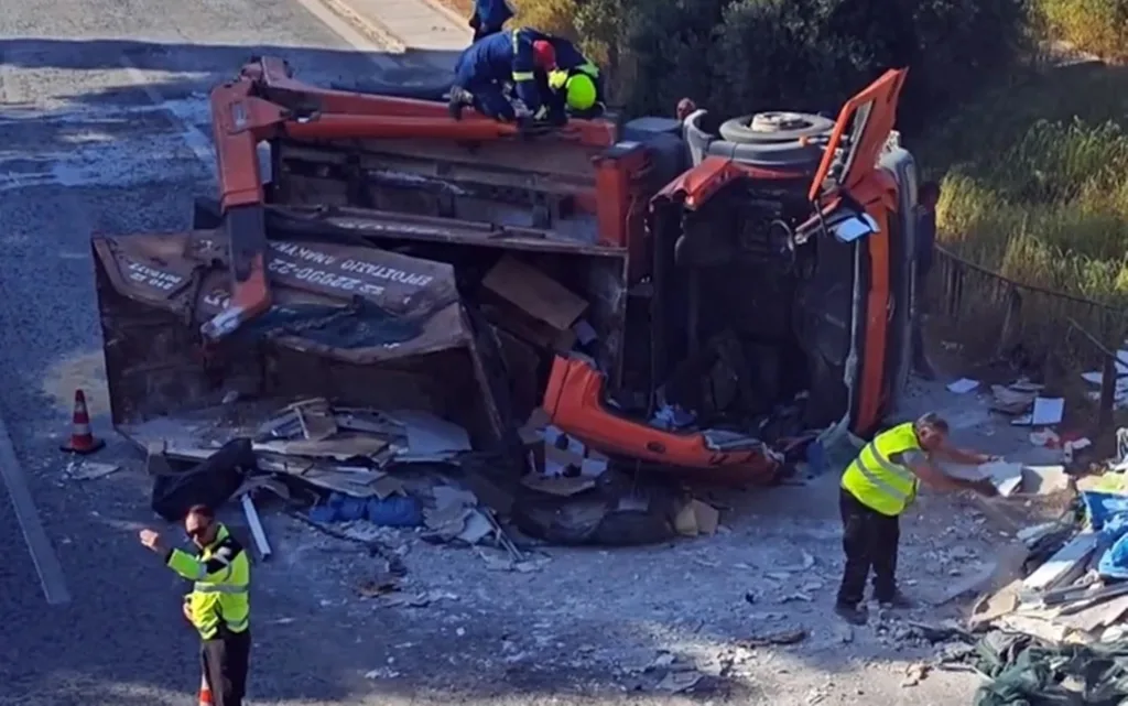 Υπό άγνωστη αιτία μετακινήθηκε το φορτίο του οχήματος (οικοδομικά υλικά, μονωτικά κ.λπ) και το φορτηγό ανετράπη και έπεσε στα πλάγια.