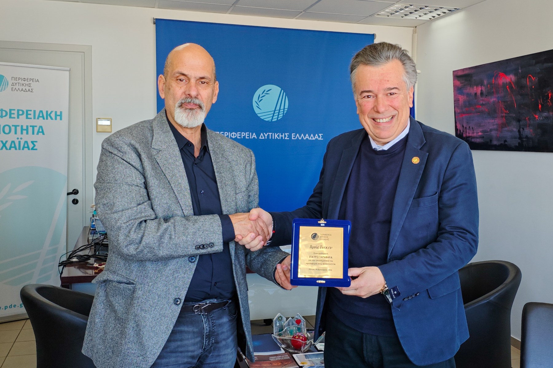Τιμητική πλακέτα απένειμε ο Αναπληρωτής Περιφερειάρχης Δυτικής Ελλάδας, Χαράλαμπος Μπονάνος, στον Καθηγητή Φυσιολογίας της Ιατρικής Σχολής του Πανεπιστημίου Πατρών, Σταύρο Ταραβήρα, χθες Πέμπτη, 26 Φεβρουαρίου 2026, αναγνωρίζοντας το σπουδαίο και πρωτοποριακό ερευνητικό έργο που διεξάγει ο λαμπρός επιστήμονας.