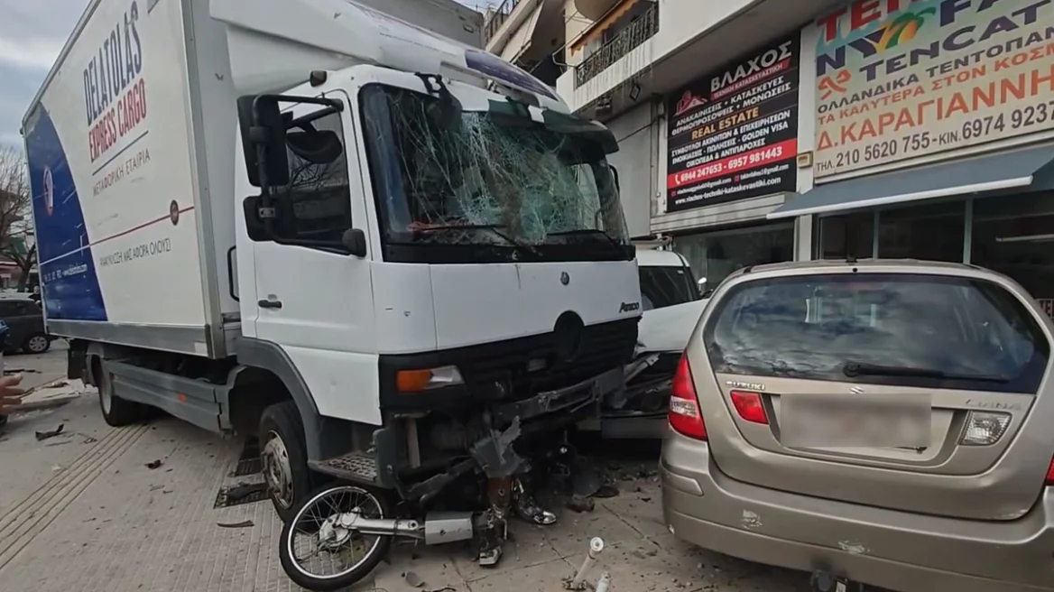 Κινούμενο προς Αιγάλεω το φορτηγό πέρασε τη διαχωριστική νησίδα, μπήκε στο αντίθετο ρεύμα και παρέσυρε τέσσερα αυτοκίνητα και σταθμευμένες μοτοσικλέτες.