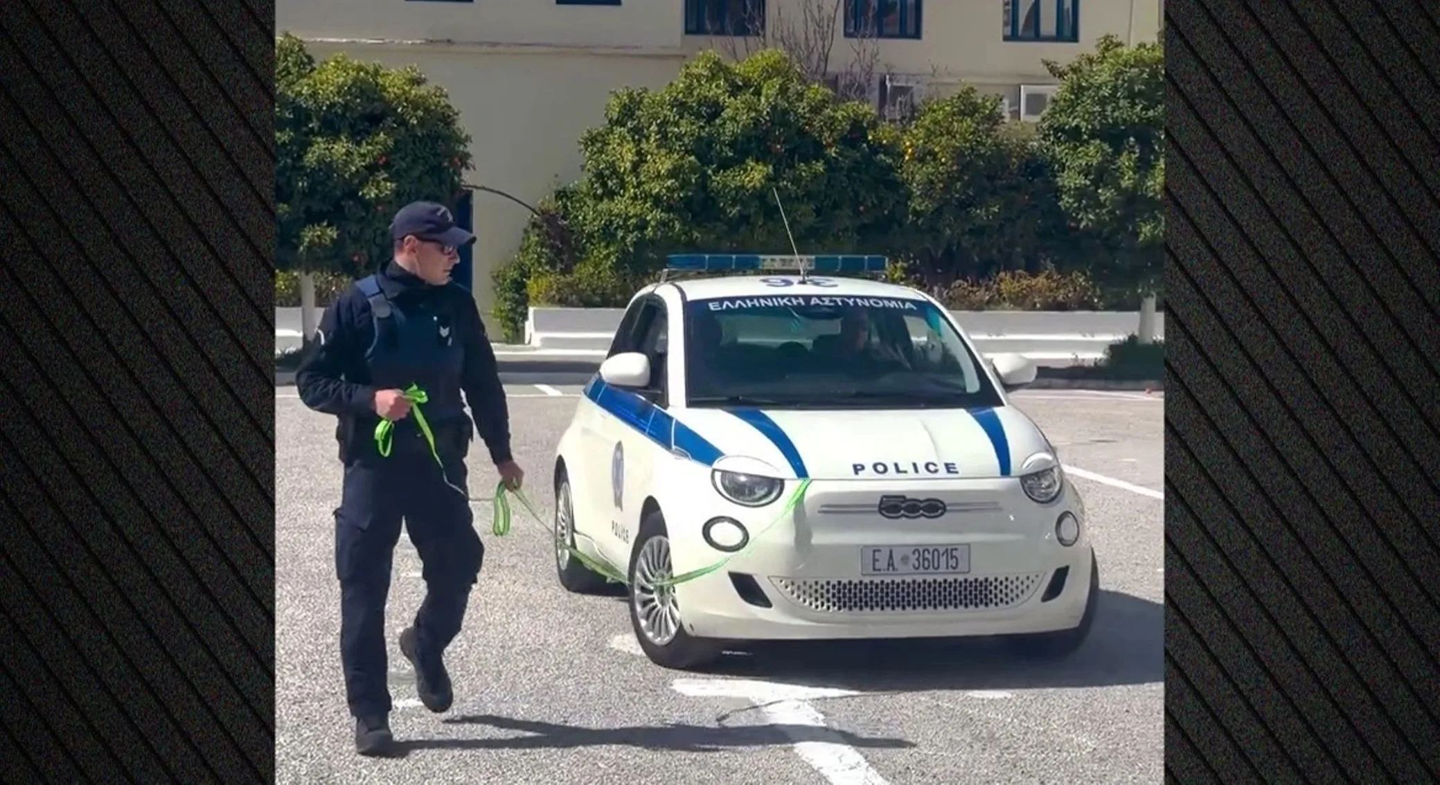 Στο βίντεο, που τράβηξε την προσοχή των χρηστών του διαδικτύου, αποτυπώνεται ένας αστυνομικός να κρατά με λουρί ένα μικρό περιπολικό (500αράκι), το οποίο είναι επιθετικό και κινείται απειλητικά σε βάρος δύο μεγαλύτερων οχημάτων τύπου τζιπ της ΕΛΑΣ.