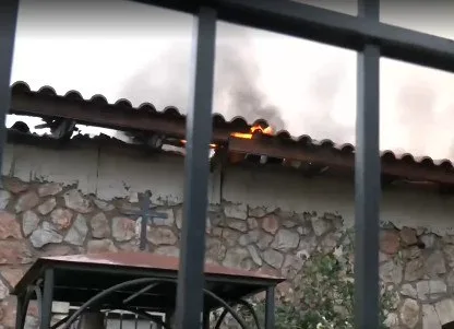 Η πυρκαγιά, σύμφωνα με την ΕΡΤ, έχει επεκταθεί σε όλο τον χώρο, με τις φλόγες να διακρίνονται από την σκεπή του οικήματος της αυτοσχέδιας εκκλησίας., ενώ εσωτερικά φαίνεται να έχει καεί ολοσχερώς το οίκημα.