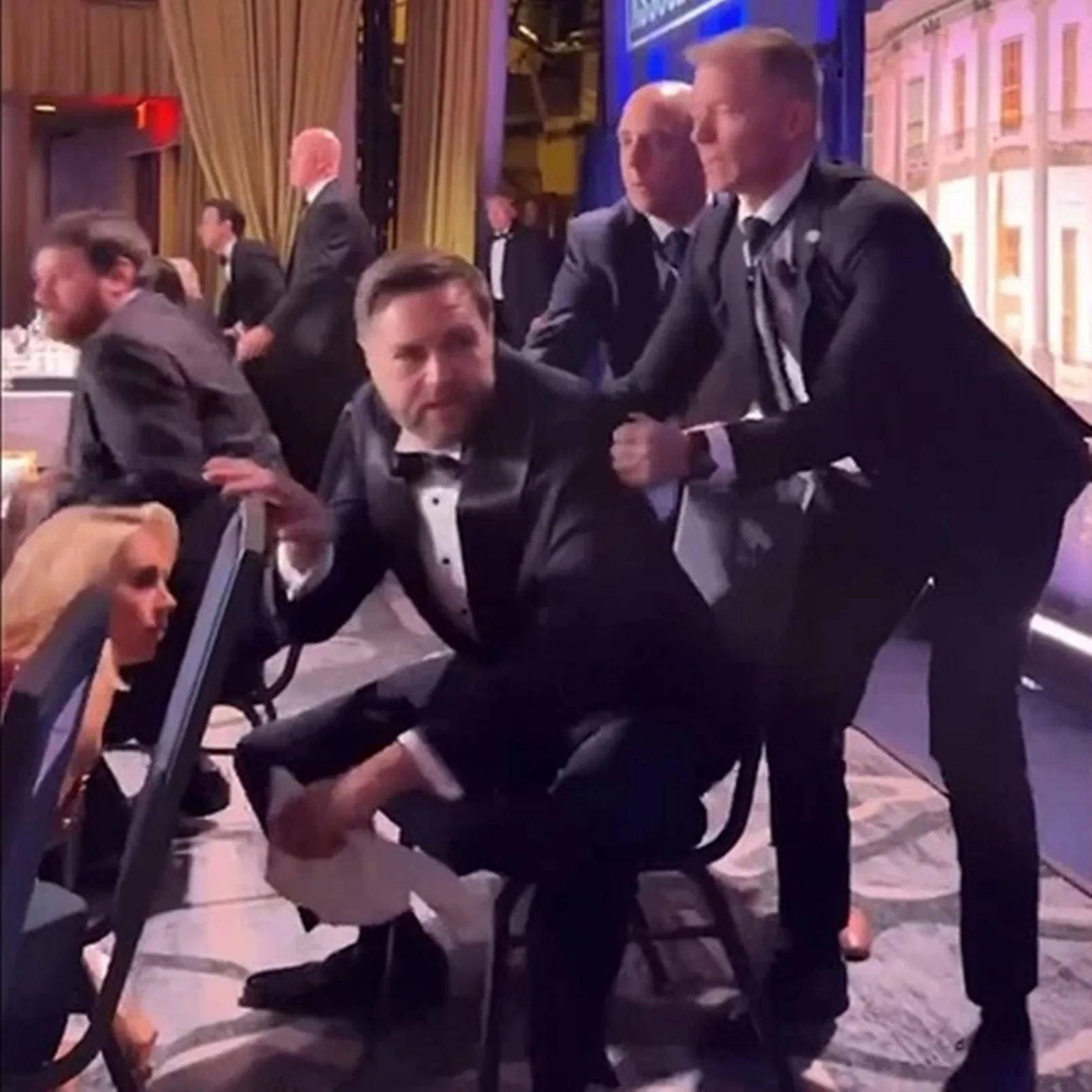Ο Αντιπρόεδρος Τζέι Ντι Βανς εμφανίζεται να οδηγείται πρώτος εκτός του χώρου από πράκτορα ασφαλείας, ενώ λίγα δευτερόλεπτα αργότερα οι ομάδες προστασίας επανέρχονται και συνοδεύουν τον Ντόναλντ Τραμπ σε ασφαλές σημείο, τη στιγμή που εκείνος βρίσκεται σκυμμένος κάτω από τραπέζι.