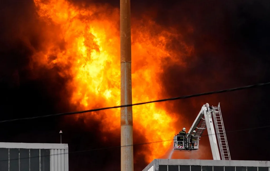 Πυροσβέστες χρησιμοποίησαν ανυψωτικό εξοπλισμό για να φτάσουν στους επάνω ορόφους, ενώ ομάδες επιχειρούν μέσα στο γεμάτο καπνούς κτίριο.