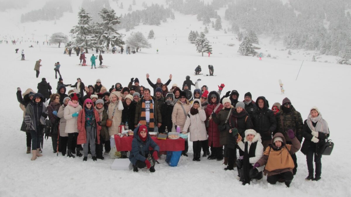 Η συνέχεια δόθηκε στις πλαγιές του Χελμού, στο πανέμορφο Χιονοδρομικό Κέντρο Καλαβρύτων. Εκεί, μέσα σε ένα εντυπωσιακό «λευκό» σκηνικό, πραγματοποιήθηκε η κοπή της πίτας.