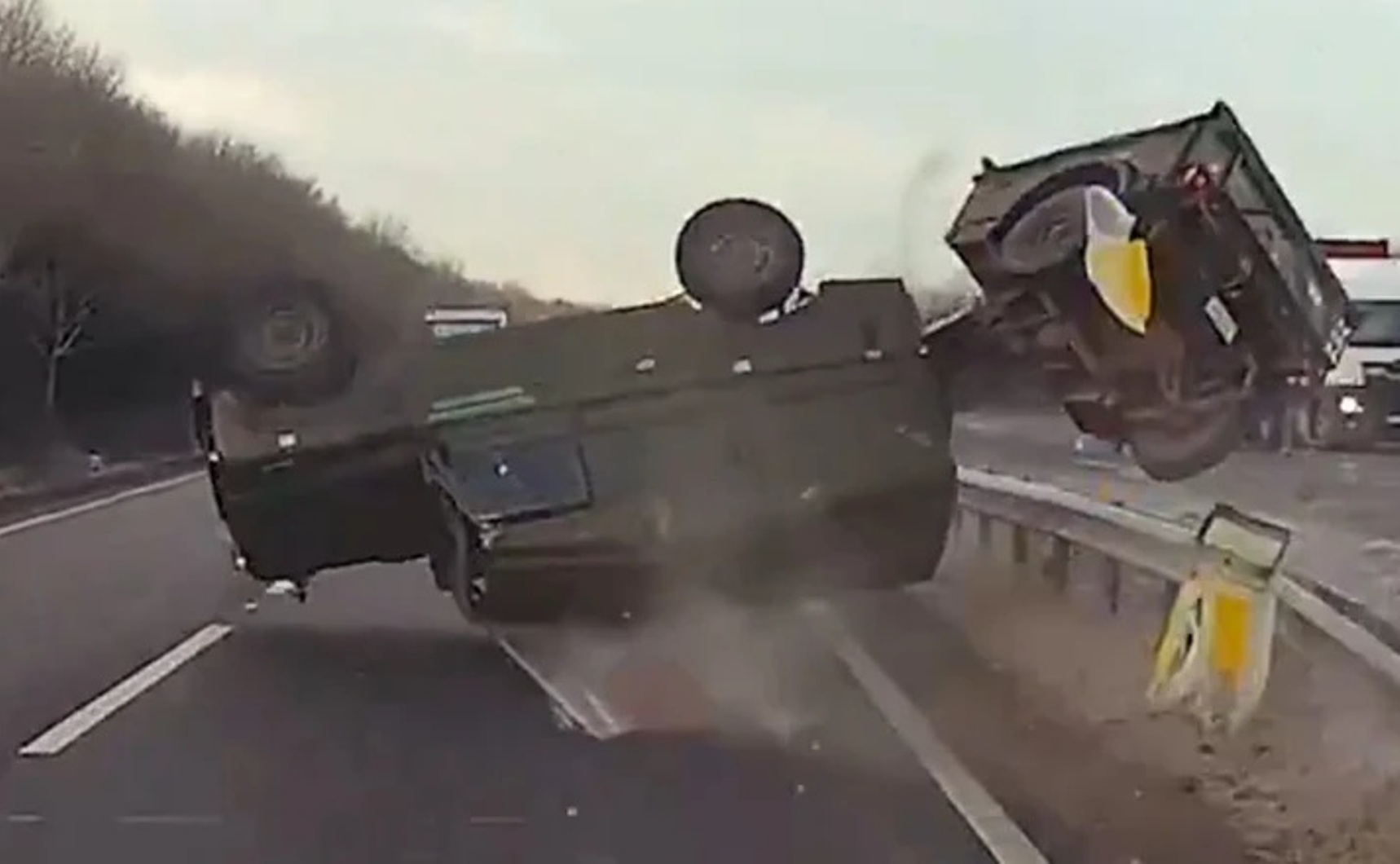 Βίντεο που κυκλοφορεί στο διαδίκτυο, δείχνει στρατιωτικό όχημα να ανατρέπεται έπειτα από επικίνδυνο ελιγμό για την αποφυγή σύγκρουσης, στη Βρετανία, σύμφωνα με δημοσίευμα της Sun.